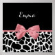 This bold and stylish design features a modern black-and-white giraffe print pattern accented by a soft dusty-rose pink ribbon and satin-style bow (flat printed graphic, not a real bow). The top half showcases a sleek, solid black background with elegant white script text that can be personalized with any name. The contrast between the wild animal-print base and the delicate dusty-rose pink bow creates a chic, fashionable look perfect for boutique branding, personalized gifts, stationery, accessories, or girly décor. Ideal for anyone who loves trendy animal prints, glam accents, and customizable designs, this layout stands out beautifully on Zazzle products.