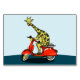 A funny giraffe riding a red moped. A fun cartoon, illustration for fans of vintage scooters and transportation.
