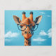 A giraffe wears stylish black-rimmed glasses against a soft blue background giving it an expressive and whimsical look.