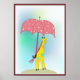 cute giraffe with a large starry pink umbrella on a blue pastel background