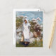 Une carte postale d'art avec la peinture, Girl and Laurel (1879), de Winslow Homer (1836-1910), un artiste américain du mouvement réaliste. Une jeune femme portant un tablier blanc avec une capote tenant un panier en osier rempli de fleurs près de buissons de laurier.