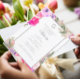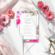 The design is pink floral on a white background with a silver coloured text that is easily changed to your information.