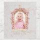There is a baby girl photo in a faux gold foil arch, with pink orchids all around the arch. . Above it, there is a cross, also faux gold foil. Under it, the name and occasion are written in a golden calligraphic script and the date in small black caps. The background is white marble.