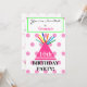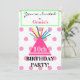 Pretty girl birthday party invite for 10th birthday or other age. NAME is written in pretty pink colour inside mint green rectangle. Brighter pink birthday hat with colourful tassel against pastel pink polka dots on white background. Backside has event detials to personalize in black typography with light pink dots background, and pink frosting chocolate cupcake and colourful balloons. Original Artwork and Card Verse Design © TamiraZDesigns