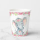 Girl elephant baby shower paper cups with adorable baby elephant with pretty floral headband on a floral background. These elephant baby shower paper cups are easily personalized with text, and you can add a background colour.