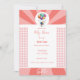 Cheerful baby shower invitation with white and pink colour. Topped with a flying baby carried in balloons. A beautiful keepsake of the most beautiful occasion