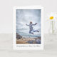 A greetings card featuring a woman jumping for joy off some rocks on a beach. Her arms and legs are partially outstretched, turning it into a crab jump. She's wearing a padded jacket against the cold and her hair is lifting in the wind. With a happy expression and eyes wide, the overall impression is of wild exuberance.