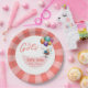 Adorable pink and white paper plate personalized with a baby girl's name, perfect for a memorable baby shower occasion.