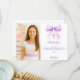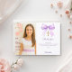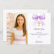 Add a vertical size photo. A lavender colored bow and a golden cross as decor. Personalize and add a name and thank you note. Purple text.