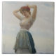 This design features a painting by the Italian artist Eugene de Blaas (1843–1931). It shows a woman collecting pebbles, seashells and stones on a sandy beach in Italy. The woman is wearing a simple dress and she is barefoot as she walks along the sand. She is rearranging her hair. Her posture shows off her simple elegance and beauty. There is a basket of small pebbles beside her bare feet. The original art was painted in 1908.