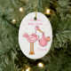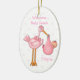 An adorable oval ceramic ornament for baby girl's arrival. Design features stork carrying pink baby bundle. Perfect for baby shower gift! Personalize with text for your special occasion.