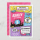 Profitez de cette invitation d'anniversaire de super-héros fille ! C'est la façon idéale pour les invités invitations à la fête d'anniversaire de votre fille sur le thème du super-héros. C'est l'ultime invitation super-héroïne comique pleine d'action pour les filles avec rose, violet, jaune et bleu!