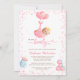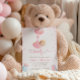 This adorable baby shower invitation features a girl teddy bear being flown by balloons with elegant script and modern text for your details. Back features teddy bear holding a balloon and text for a book request, or can be deleted for a clean look. Easy to customize by clicking "Personalize".