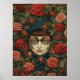 Poster featuring a Naive Art illustration of a girl wearing a dark green hat and glasses, surrounded by red roses.