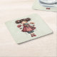 Paper (sturdy pulp board) coasters with a cute retro image featuring a whimsical girl with rosy cheeks and flowers in her hair. Carrying a green frog doll.