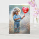 Cute little girl is barefoot and wearing denim ripped blue jeans and holding a red heart balloon in a country field for a 40th birthday.
