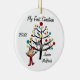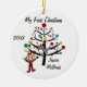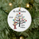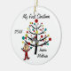 A pretty round ceramic keepsake Christmas holiday ornament features a stick figure girl in a red sleeper in front of the decorated Christmas tree that the cat is in, and areas where you can add text including the current year and child's name. This is an adorable gift for any baby girl celebrating her first Christmas!