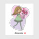 Cute mini art of a whimsical girl with long flowing yellow hair and wearing a green dress and striped stockings. She is holding a beautiful bunch of red roses in her outstretched hands. Originally made as digital art, An adorable sticker of artwork ideal for sending to a friend or loved one or for yourself if you like to collect mini art.