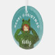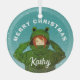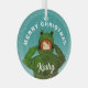 Cute Girl with Green Frog Hoody Drawing Christmas Glass Ornament. A cute drawing of a girl wearing a green frog hoody and a custom name. Fun, holiday design with snowflakes for a girl. Add your name and text.