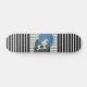 A cool skateboard with bold and modern black & white stripes, a cool gingham pattern and a girl comic character with a tablet in her hands with a peace symbol sticker on it.