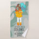 Girl with Umbrella in Wind Positive Quote Towel Set. This drawing portrays a girl standing in the wind, her back turned towards the viewer. She is holding an umbrella. The girl's hair is being blown in the wind. The positive text says "Carry your colours even on the cloudiest days".