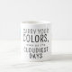 Girl with Umbrella in Wind Positive Quote Coffee Mug. This drawing portrays a girl standing in the wind, her back turned towards the viewer. She is holding an umbrella. The girl's hair is being blown in the wind. The positive text says "Carry your colours even on the cloudiest days".