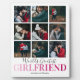 Personalized girlfriend photo plaque featuring a stylish white background that can be changed to any colour, a 9 picture collage template for you to customize, the saying "worlds greatest girlfriend", and your names.