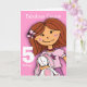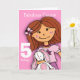 This card says: Fabulous Cousin 5 today. Inside: Happy Birthday. Or customize with your own words. Fun card dark hair girl cuddling her white bunny illustrated and designed by Sarah Trett.