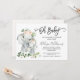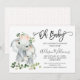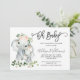 Sweet girl's safari animals baby shower invitation featuring an elephant and her calf as well as a decorative black calligraphy heading and pink floral arrangement and foliage. This is a sweet way to invite guests to a little girl's elephant themed baby shower.