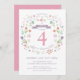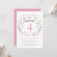 This elegant and pretty third birthday invitation features an illustrated floral wreath with the words "Let's Celebrate" encircling the number 4. The text colour, font, and message can be changed to your liking. The back of the invite features a pink background (that can be swapped to any colour of your choice) with a white quatrefoil pattern. A perfect way to invite guests to celebrate a girl's special birthday.