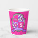 Personalize these medieval crest shield birthday party paper cups with your own birthday girls name. Ideal for using at a knights medieval themed kids birthday party. Girl version with a unicorn, heart crown age and name in pink and purple. © Original graphic art and design by Sarah Trett. www.mylittleeden.com