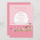 A fresh-looking invitation in shades of pink with a flower border. The border can be dragged to any location, made larger or smaller (+-) or eliminated. The background has pink on pink polka dots, a ribbon-hoop centre and a pink on pink check bottom. It's all overlaid with a white scalloped centre decal.