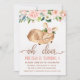 Girl's oh deer birthday invitation featuring a blush colored watercolor floral arrangement at the top of the design and a cute watercolor deer. The design also features a calligraphy heading in a faux rose gold glitter. Great for a deer themed first, second or third birthday party for a little girl.