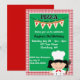 This customizable Pizza Party invitation features a banner of slices of pizza and a girl dressed as a chef.