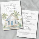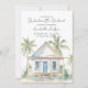Beach House Tropical Bachelorette Invitation. Set the tone for a breezy and fun tropical beachside bachelorette or girls' weekend with this charming design. The front features a clean white background with the text displayed at the top, drawing attention to the beautiful watercolor artwork at the bottom. A picturesque beach house, painted in white and tan with a blue door and windows, is surrounded by green palm trees, sandy dunes, and beach grass, creating the perfect seaside vibe.