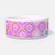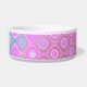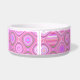White ceramic dog food / water bowl, with abstract graphics done in pink, blue, aqua and green. Personalize the bold pink text for your pet or as a great gift idea for any pet owner.
