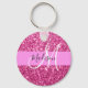 Girly and glam hot pink glitter sparkles white monogram name and initial keychain. Your custom name and monogram are written in an elegant hand lettered script with a pink background. A perfect birthday or Christmas gift!