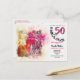 Ce design "50 et Fabuleux" d'invitation à la fête d'anniversaire comprend un splash magenta avec un vélo d'aquarelle et un panier sur les guidons penchés contre un tonneau. Tout ceci est sur le côté gauche de l'invitation. Toutes les informations sur la typographie et le modèle se trouvent à droite et à l'adresse au verso. Personnalisez les champs de texte avec vos informations.