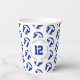 These volleyball themed birthday party paper cups feature multiple small stylized blue & white volleyballs arranged in a simple drop pattern - text on a white circle graphic can be customized, currently the number 12 to represent a child's age encircled by the words, "Happy birthday" - by katz_d_zynes