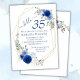 Girly chic navy blue floral 35th birthday invitations with gold frame for her in pretty blue flowers.