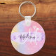 Girly and cute keychain with a colourful pink, peach, purple, lilac and blue unicorn rainbow hearts sparkly background. Your custom name and monogram are written in an elegant hand lettered script with a lilac purple unicorn paint brush strokes stripe background. A perfect birthday or Christmas gift!