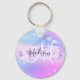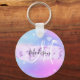 Girly and cute keychain with a colourful pink, purple, lilac, blue and aqua unicorn rainbow hearts sparkly background. Your custom name and monogram are written in an elegant hand lettered script with a lilac purple unicorn paint brush strokes stripe background. A perfect birthday or Christmas gift!