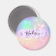 Girly and cute magnet with a colourful pink, peach, purple, lilac, blue and green unicorn rainbow hearts sparkly background. Your custom name and monogram are written in an elegant hand lettered script with a lilac purple unicorn paint brush strokes stripe background. A perfect birthday or Christmas gift!