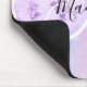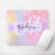Girly and cute mouse pad with a colourful pink, peach, purple, lilac and blue unicorn rainbow hearts sparkly background. Your custom name and monogram are written in an elegant hand lettered script with a lilac purple unicorn paint brush strokes stripe background. A perfect birthday or Christmas gift!