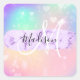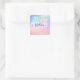 Girly and cute square sticker with a colourful pink, peach, purple, lilac, blue and green unicorn rainbow hearts sparkly background. Your custom name and monogram are written in an elegant hand lettered script with a lilac purple unicorn paint brush strokes stripe background. A perfect birthday or Christmas gift!
