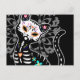 A cute Day of the Dead kitty cat on a grey / grey damask black background. on a postcard great for Halloween or dia de muertos