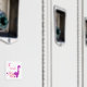 A cute personalized kids cartoon dinosaur magnet featuring pre-historic dinosaurs from the Jurassic period of a Bronotosaurus in a glittery purple effect color and a Triceratops in a pale pink but with purple glittery horns. A sweet pretty design for a young girl . Add the child's name to make an extra special gift for a birthday or any other occasion.