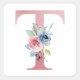 Elegant, Feminine and pretty letter T floral monogram sticker. features blue and pink flowers and greenery accents with faux pink foil typography. You can personalize by adding a name This floral letter T monogram sticker will be perfect as a gift.
