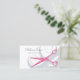 A girly hair salon business card for the modern hairstylist featuring a pair of glitzy hot pink scissors designed with a fun sequin style pattern entwined in a mass of silhouette curls. Personalize by adding your name and contact information to the back. There is a line for special instruction such as a reminder for your clients next appointment. Flat printed image, NOT metallic or sequins.