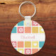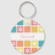 A girly square tile pattern keychain with modern style rounded corners in pretty spring colours, decorated with cute hearts and retro daisy flowers. Personalize by adding the name of any girlie girl to this retro mod design in shades of coral pink goldenrod yellow, and turquoise blue.